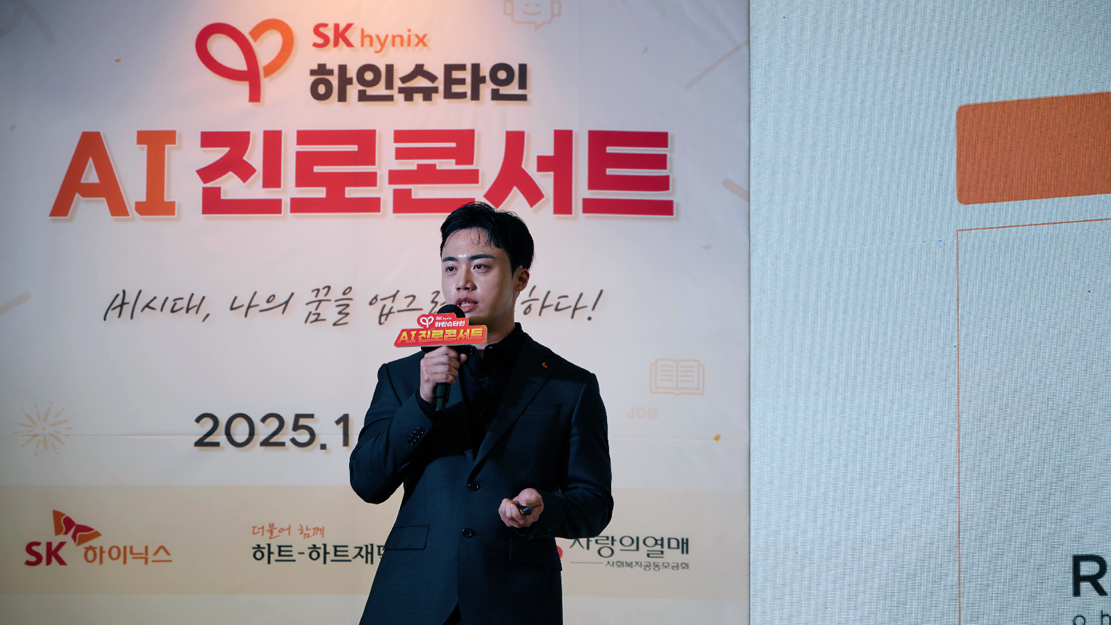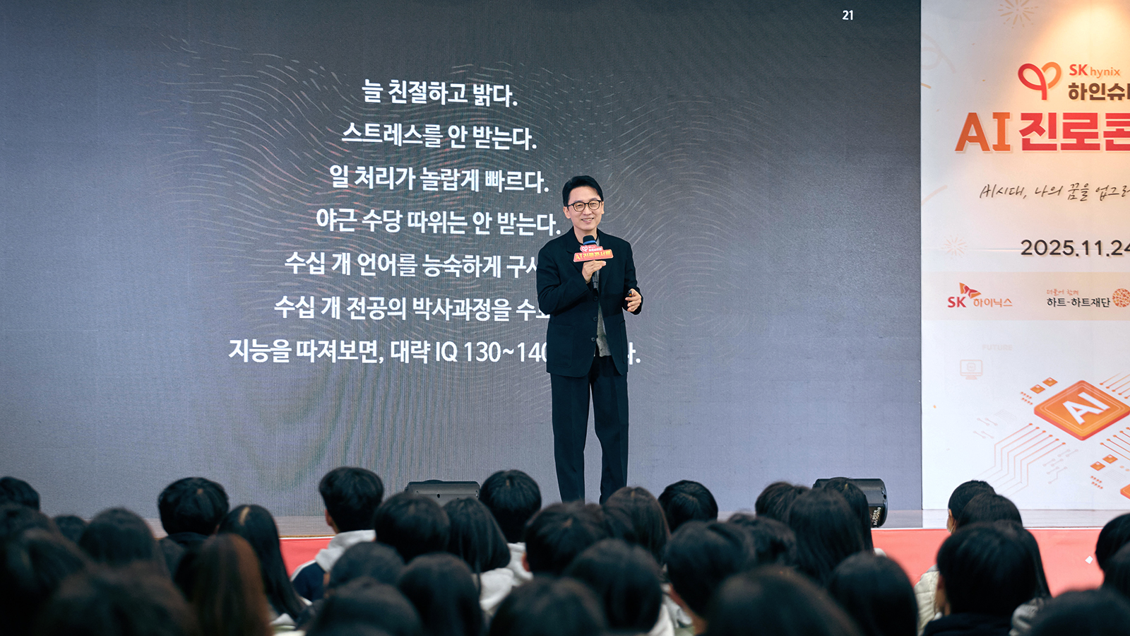 세 번째 강연은 SK하이닉스 상정현 TL(SYLD Tech)이 진행했다. 상 TL은 반도체 개발 현장에서의 AI 활용 경험과 엔지니어로 성장해 온 과정을 소개하며, 미래 기술 인재가 갖춰야 할 역량을 공유했다. 그는 지난해 하인슈타인 대학생 멘토링에 멘토로 참여했으며, 올해 ‘SK hynix AI/DT Summit 2025’ AI 경진대회에서 대상을 수상하고 상금 전액을 기부하며 사회적 가치 실천에도 앞장서고 있다. 이번 강연 역시 재능 기부의 일환으로 참여했다. 상 TL은 “AI 시대에도 사람의 역할이 무엇보다 중요하며, 결국 AI라는 도구를 이해하고 활용하는 사람이 AI 시대의 주인공이 될 것”이라며 “이번 콘서트로 학생들이 ‘나도 할 수 있다’는 자신감을 얻길 바란다”고 말했다.