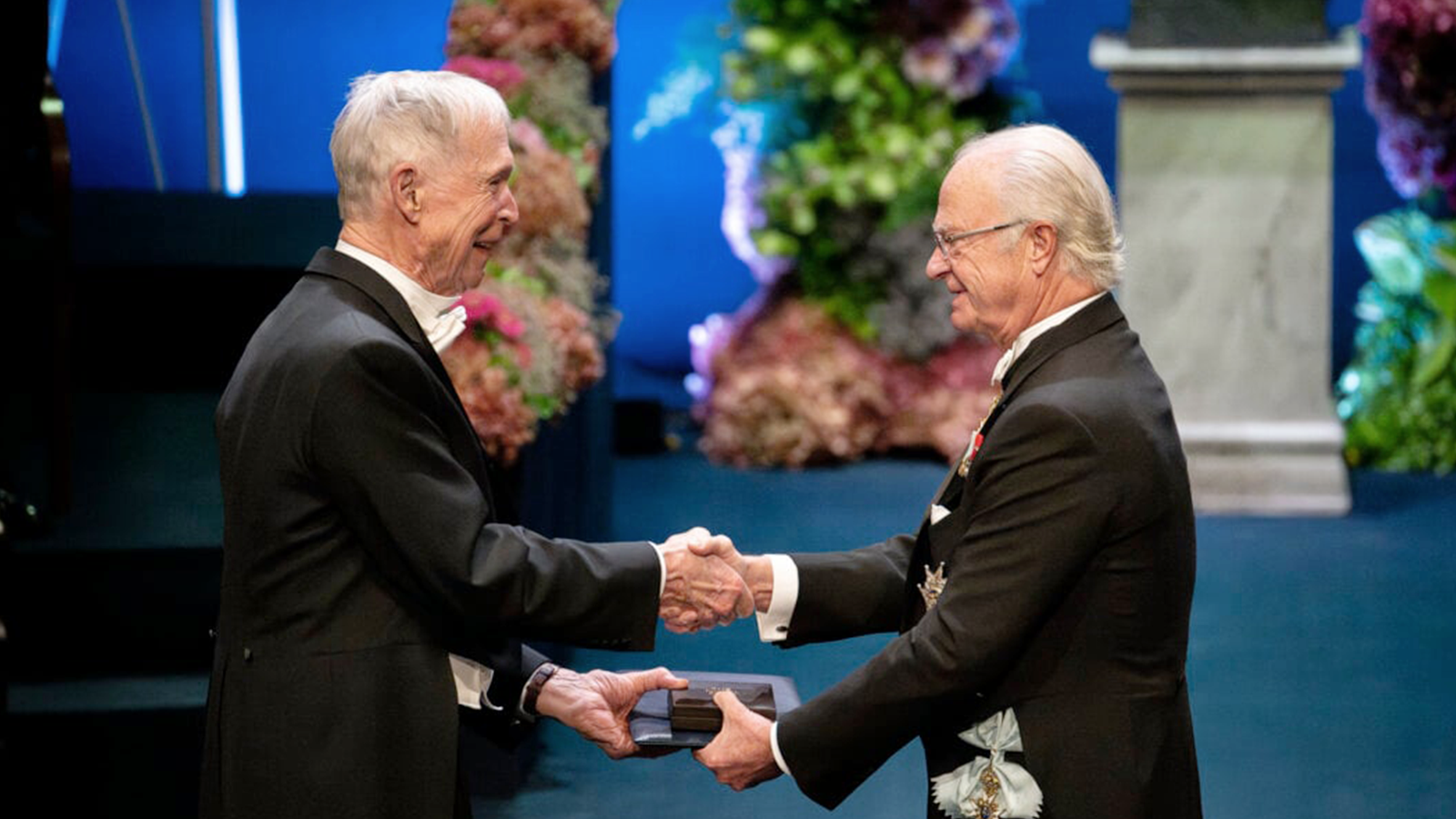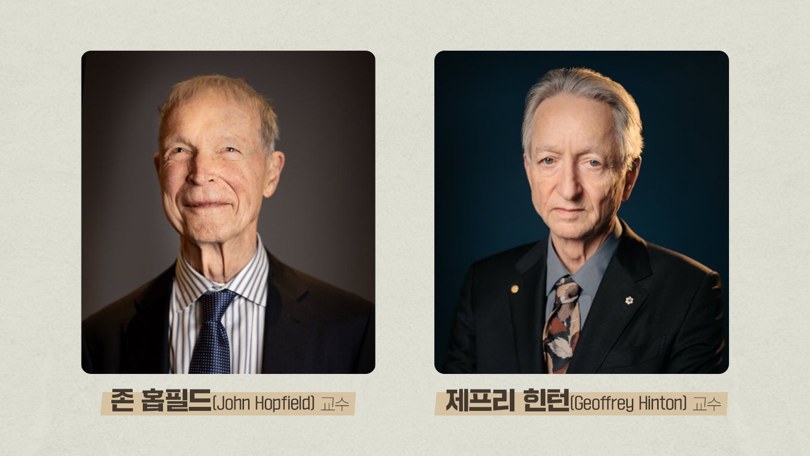 ▲ 노벨 물리학상을 수상하고 있는 존 홉필드 교수(왼쪽)(출처: 노벨 재단)