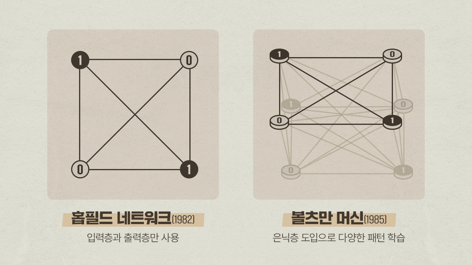 오늘날의 AI를 구성하는 신경망에 대한 기본 이론은 이미 1950년대에 제시되었으나 실제로 의미 있는 결과를 얻지 못해 큰 주목을 받지 못했다. 그러나 1980년대 등장한 존 홉필드(John Hopfield) 교수의 홉필드 네트워크*와 이를 변형한 제프리 힌턴(Geoffrey Hinton) 교수의 볼츠만 머신* 덕분에 신경망을 이용한 연산이 다시 관심을 끌게 되었다.
