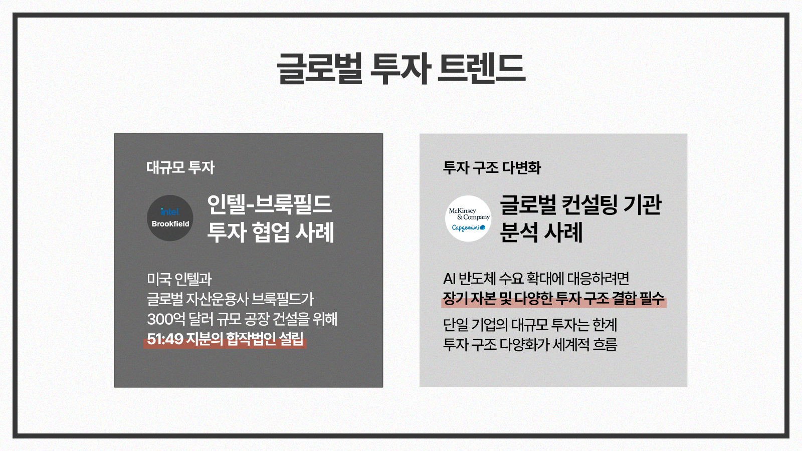 인텔은 대규모 반도체 공장 건설 과정에서 자본 투자를 적극적으로 활용하는 전략을 취하고 있으며 시사하는 바가 큽니다. 인텔은 300억 달러 규모의 미국 애리조나 챈들러 공장 건설을 위해 글로벌 자산운용사인 브룩필드와 51:49 지분의 합작법인을 설립했습니다. 이를 통해 인텔은 기술∙운영 주도권은 유지하면서 자본 부담과 투자 리스크를 분산하고 대규모 투자를 안정적으로 집행하고 있습니다.