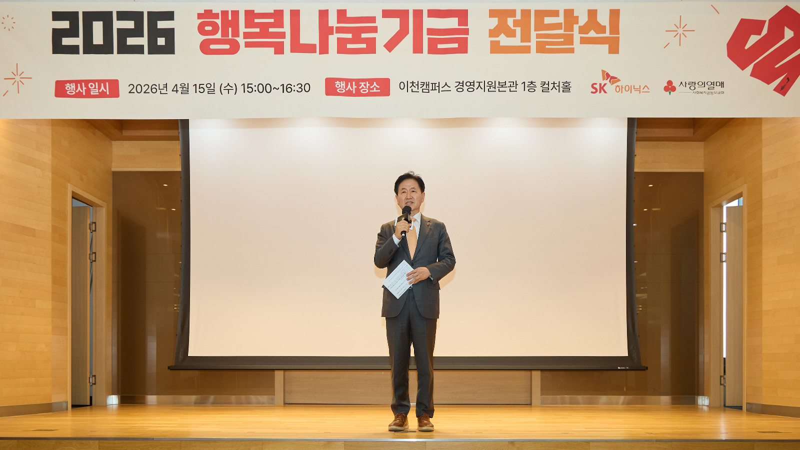 SK하이닉스가 지난 15일 이천캠퍼스에서 ‘2026 행복나눔기금 전달식’을 개최하고, 지난 한 해 동안 구성원들이 자발적으로 모금한 행복나눔기금 23억 7,000만 원을 사회복지공동모금회에 전달했다.