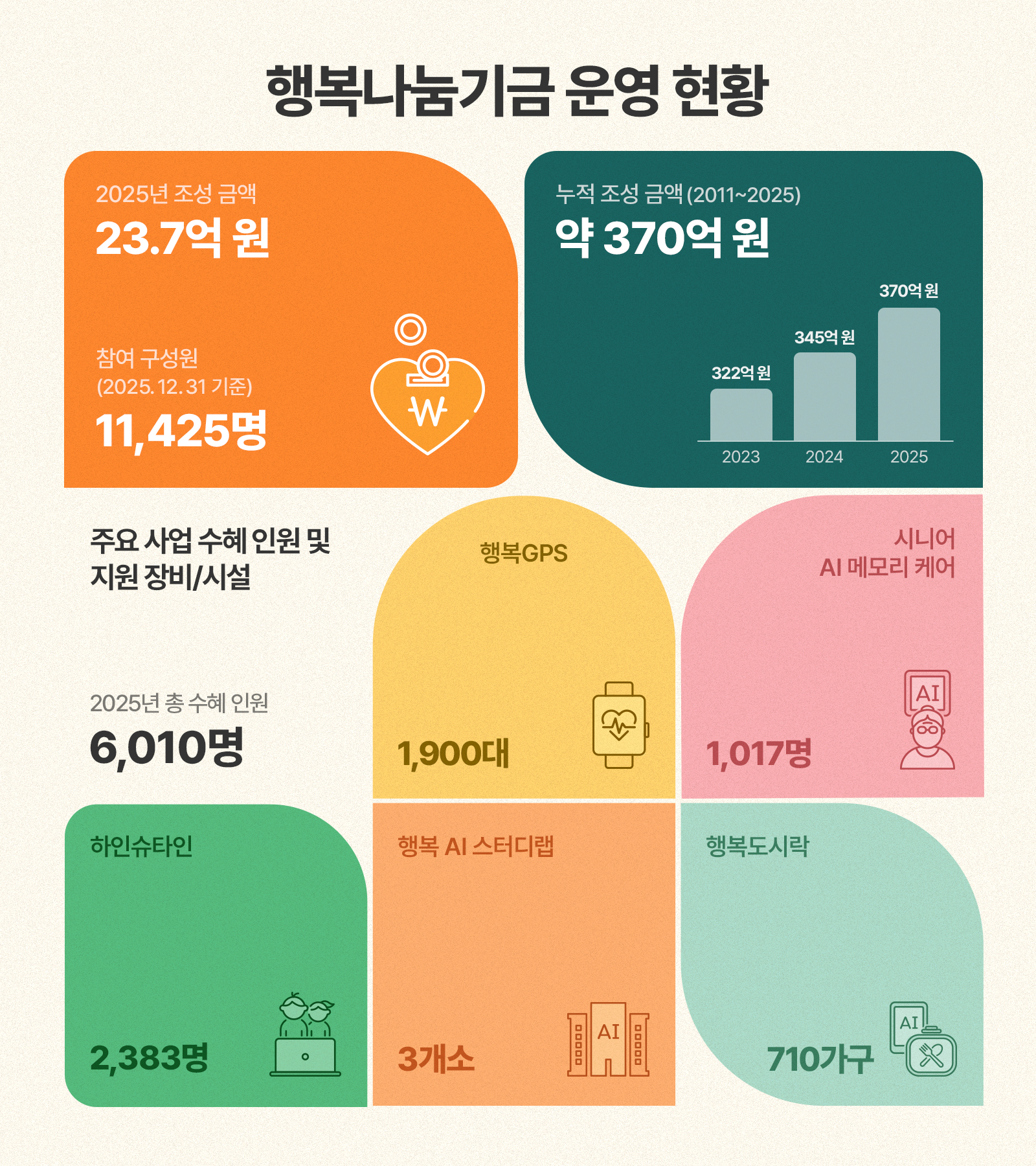 기금 전달식에서는 2025년 기금 운영 결과와 2026년 운영 계획이 함께 소개됐고, 사업 수혜자들의 감사 인사가 담긴 영상도 공유됐다. 지난해 행복나눔기금 사업에는 총 23억 5,000만 원의 사업비가 투입됐고, 총 수혜 인원은 6,010명으로 집계됐다.