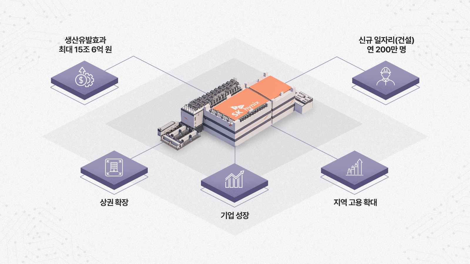 지표 · 산식에 따라 간극은 있으나 파생되는 경제 효과도 상당할 것으로 추정된다. 선행연구(고려대)의 경제성 분석에 따르면, P&T7과 비슷한 규모의 팹 1기 건설 시 발생하는 생산유발효과는 15조 6,000억 원, 부가가치는 5조 7,000억 원에 달하며, 건설 후 생산 단계에서도 각각 13조 7,000억 원, 5조 9,000억 원의 효과가 있는 것으로 알려졌다. 지역 세수 확대도 가시적이다. SK하이닉스는 청주시에만 2025년 1,000억 원대의 법인지방소득세를 납부했고, 향후 호실적과 시설 투자 등에 따라 지방재정 증대에 더 크게 기여할 전망이다.