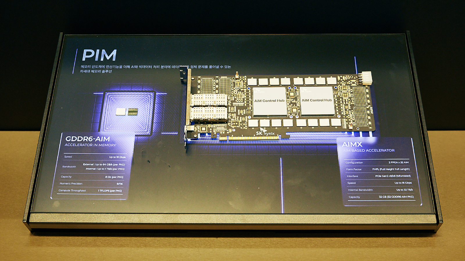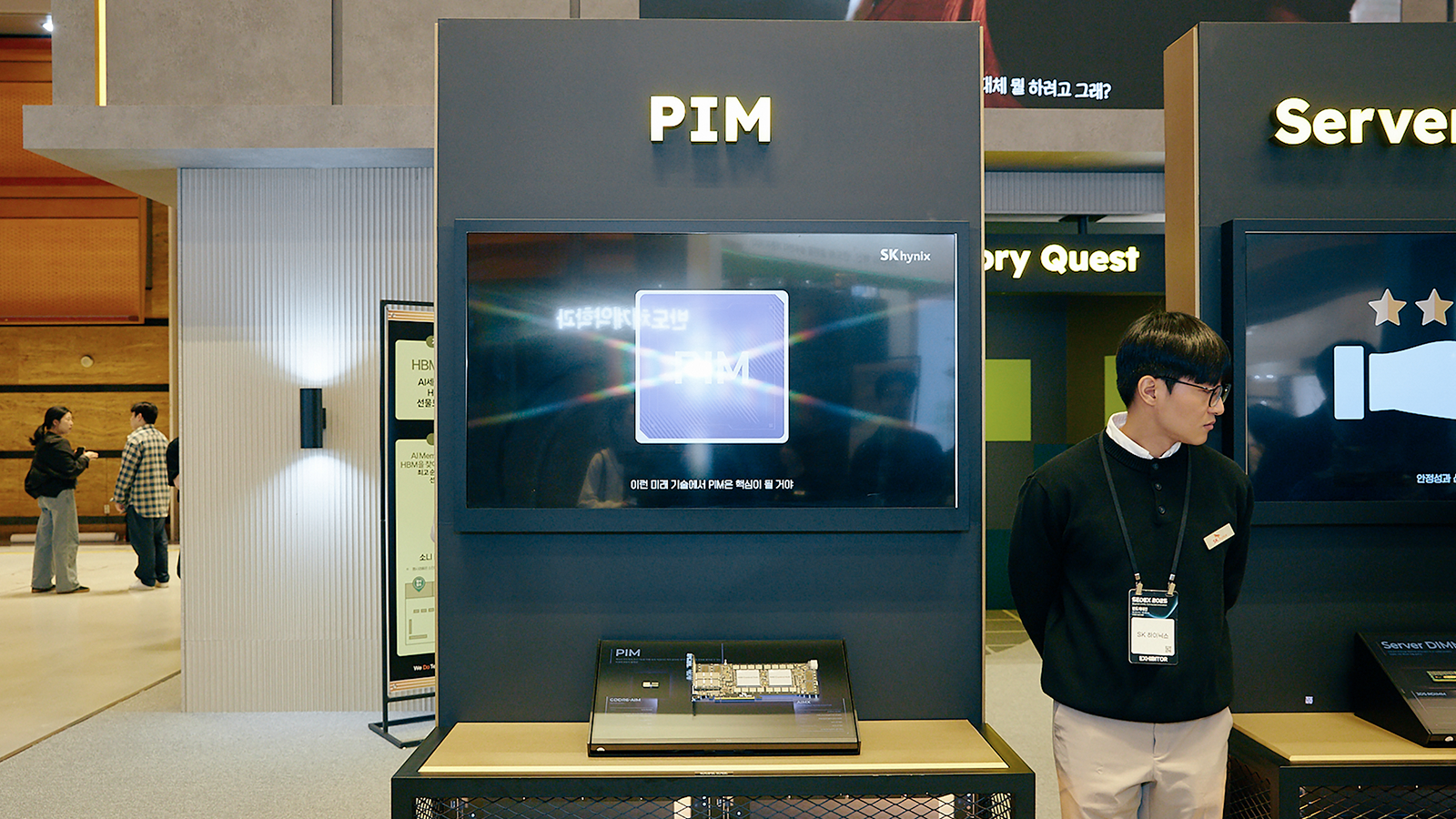 HBM 전시존 왼쪽에는 PIM, ServerDIMM, eSSD 섹션을 만나볼 수 있다. PIM 섹션에서는 메모리 내에서 연산 기능까지 수행할 수 있는 ‘GDDR6-AiM’ 칩과 이를 여러 개를 탑재해 구동하는 AI 가속기 ‘AiMX’가 소개돼 있다. 또, ServerDIMM 섹션에서는 3DS* RDIMM과 Tall MRDIMM*과 같이 차세대 서버 시장을 겨냥한 고성능 서버용 모듈을 만나볼 수 있다. eSSD 섹션에서는 이전 세대 대비 두 배의 대역폭을 제공하는 ‘PS1012’, 세계 최대 수준인 245TB(테라바이트) 용량을 구현한 ‘PS1101’을 살펴볼 수 있다.
