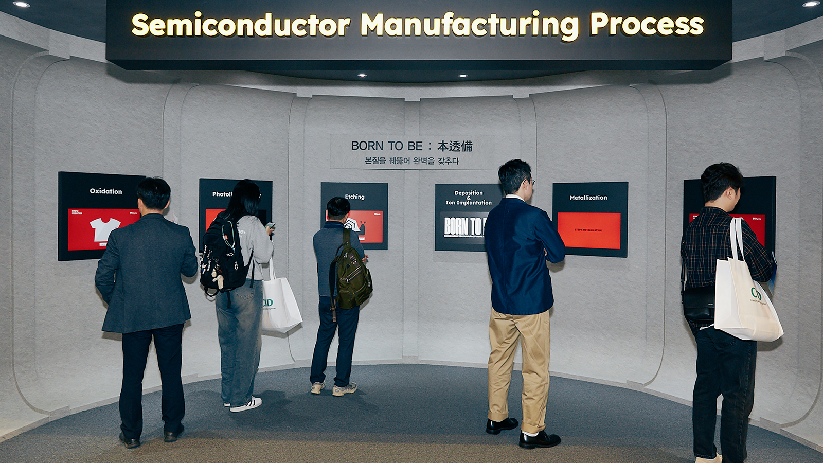 HBM 전시존 뒤편에서는 반도체 8대 공정을 모션그래픽 영상으로 소개하는 디스플레이 월이 관람객을 반겼다. ‘본질을 꿰뚫어 완벽을 갖추다’라는 뜻을 가진 ‘Born to Be: 本透備’를 슬로건으로 마련된 이 공간에서는 공정별 모션그래픽 소개 영상을 활용해 반도체 제조 과정을 학생, 일반인 관람객의 눈높이에 맞춰 알기 쉽게 풀어냈다.