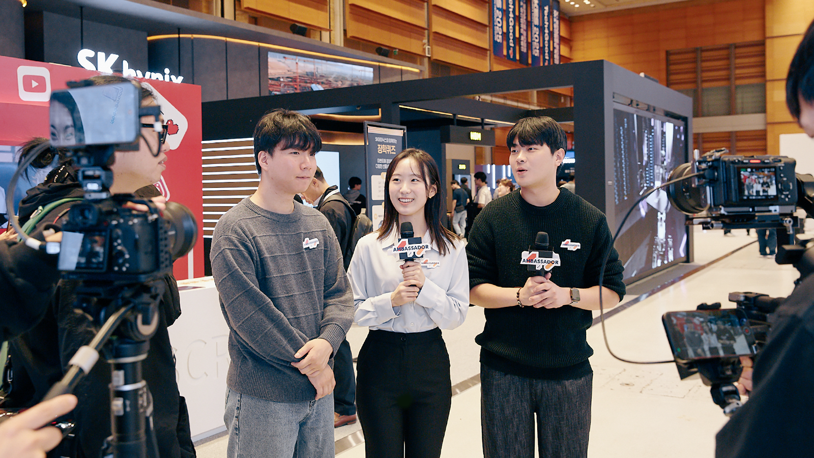 ▲ 전시관 곳곳을 살피며 주요 전시를 영상으로 담고 있는 SK하이닉스 대학생 앰버서더들의 모습