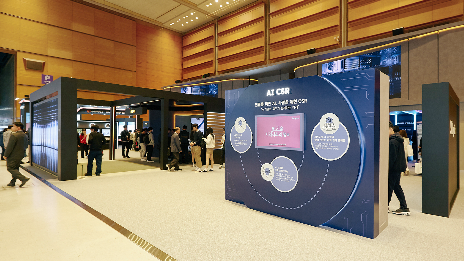 이번 전시에서는 SK하이닉스가 AI를 기반으로 펼치고 있는 주요 사회공헌 전략과 사업을 소개하는 전시존도 마련됐다. SK하이닉스는 기술이 인재를, 인재가 기술을 키우는 선순환을 이루기 위해 프로그램, 경험, 인프라를 연계한 올인원 AI 교육 모델을 구축하고 AI 활용 능력을 갖춘 미래 인재 양성에 많은 노력을 기울이고 있다. 또한 ▲행복도시락 프로그램에 AI 영양사 도입 ▲수혜자 맞춤형 컨설팅 및 디지털 스마트케어 시행 ▲이주민 대상 AI 이노테이터 양성 교육 등 AI로 기존 사회공헌 프로그램을 고도화해 더 촘촘하고 선제적인 AI 대응형 사회안전망도 구축해 가고 있다.