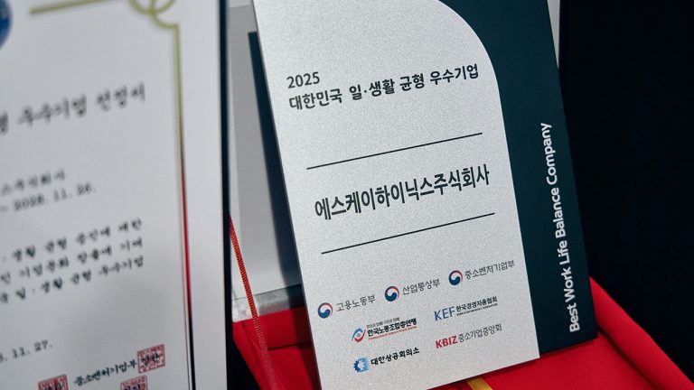 SK하이닉스, ‘2025 대한민국 일·생활 균형 우수기업’ 선정… 근무·휴가·돌봄 전반의 혁신 성과 인정 받아 2025-11-28 CULTURE & 구성원행복 기업문화 워라밸 행복경영